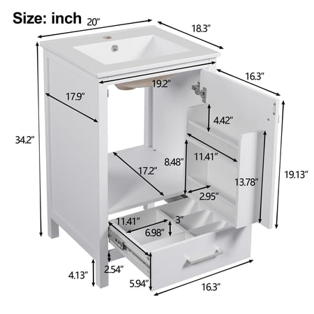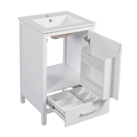 Maximize your small bathroom with the Noble House 20" Modern Vanity, featuring a space-saving design and smart organization. The solid wood frame and MDF structure ensure lasting durability, while soft-close doors and drawers provide quiet, smooth operation. A double-layer door organizer and divided drawer keep essentials neatly arranged, making the most of every inch. The ceramic sink includes an overflow and faucet hole for easy setup and maintenance. Finished in sleek white with silver handles and adjustable feet, this vanity offers both function and contemporary elegance in compact bathrooms.