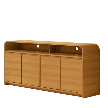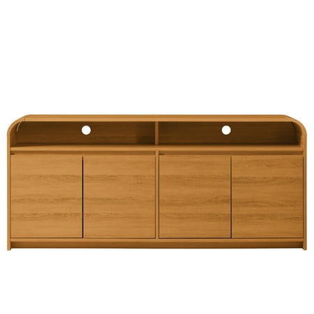 Elevate your entertainment space with the sophisticated Better Homes & Gardens Juliet TV Stand in a warm light honey wood finish. This contemporary media console boasts a gently curved top edge and open shelving for stylish display and storage. Designed with discreet cable management cutaways in the back panel to hide unsightly cords, it features a spacious lower cabinet with four solid wood doors and adjustable shelves, offering versatile storage for audio and video components, board games, and other media essentials. Crafted with quality construction and designer-inspired details, this TV stand is perfect for modern, minimalist, or contemporary décor. Whether you set your TV on the stand or mount it on the wall, this elegant, honey wood media console adds a refined, functional accent to any living room.