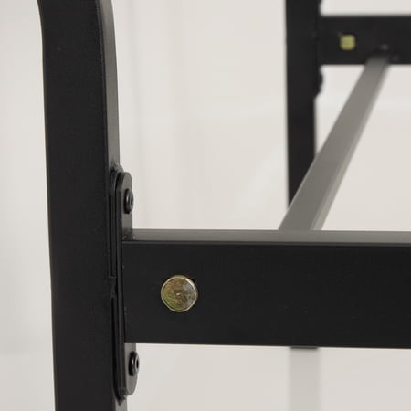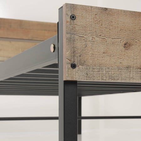 Twin bed with black metal frame and rustic reclaimed barnwood laminate head and foot board. It minimalist design takes very little space and provides additional storage space under the bed. The black powder coated metal frame adds stability and style. Features: Materials: Paper laminate wood Finish: Rustic reclaimed barnwood laminate brown Black metal powdercoated frame adds stability and a minimalist design to your room Rustic reclaimed barnwood laminate headboard and foot board panels add a rustic feel to this twin sized bed No boxspring required with the sturdy metal slats across bed frame Plastic foot inserts for each leg protect your floors from being scratched by the metal legs Ample storage space beneath bed with 11.25" of clearance Specifications: Product Dimensions: 34"H x 38.25"W x 80.5"D Product Weight: 46 lbs Warranty: 90 days