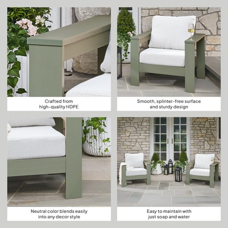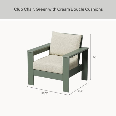 Transform your patio into a welcoming retreat with the Better Homes & Gardens Ezra Outdoor HDPE Club Chair, Teak with Cream Boucle Cushions. Designed for comfort and style, this generously sized outdoor chair features a wide, supportive seat that’s perfect for lounging and entertaining. The weather-resistant construction offers the look of wood with the long-lasting performance of durable patio furniture. It's built to withstand the elements, maintaining its beauty season after season and making it an ideal choice for any outdoor living space. Create a custom look anytime and elevate your outdoor furniture set with your favorite chair cushions from the Better Homes & Gardens collection.