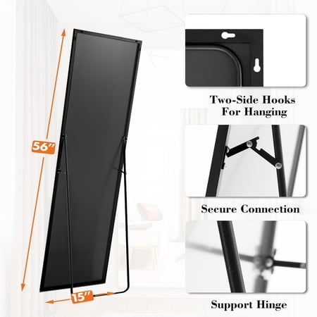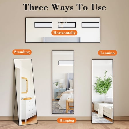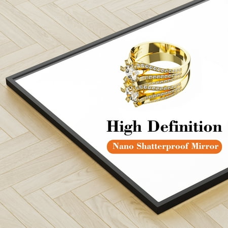 Our newly designed full-length aluminum alloy frame mirror. Measuring 56" in length and 15" in width, this mirror provides a complete view of your figure in a single glance. The sleek and durable aluminum alloy frame is only 0.23" in width and features a wire drawing treatment for a refined texture. The mirror is made with innovative explosion-proof nano-glass for superior clarity, durability, and safety. The mirror also includes an explosion-proof design on the reverse side for added protection. With no assembly required, this mirror can be placed in various locations, making it perfect for bedrooms, living rooms, checkrooms, home gyms, hallways, or clothing stores. Add elegance and positivity to your everyday with this functional and aesthetic piece.