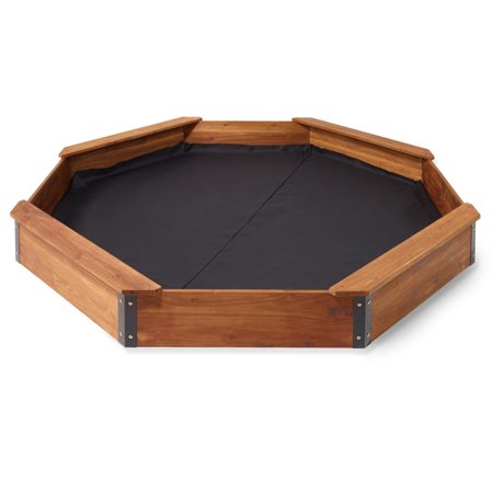 Unleash creativity and adventure in your own backyard with the Badger Basket Octagon XL Sandbox. Designed to provide a space for endless exploration and imaginative play, this sandbox is a safe environment for children to develop their fine and gross motor skills while engaging in immersive play. The Octagon XL Sandbox holds up to 1000 pounds of sand (sold separately), offering a generous play area large enough for multiple kids to enjoy simultaneously. Its unique octagonal shape features four built-in bench seats, creating a comfortable and inclusive space where kids can rest and interact while playing. Equipped with a reliable drainage liner, this sandbox ensures proper rainwater drainage, maintaining the quality and longevity of the sand. The included cover shields the wood and sand from the elements while also preventing critters and small animals from accessing the sand, ensuring a clean and safe play environment. Featuring powder-coated steel hinges and bolts, the Badger Basket Octagon XL Sandbox is built to last, offering sturdiness and reliability for long-term use. Sandbox is made from sturdy acacia wood with a cedar look finish. The liner and canvas cover are 100% Polyester. Overall sandbox measures 78 inches L x 78 inches W x 9 inches H. Each bench seat can support up to 175 pounds. Do not install the sandbox on top of bricks, pavers, or concrete because this can interfere with drainage and damage the product. All finishes are non-toxic. Meets all current, applicable safety standards. Adult assembly required. Illustrated instructions included. Product includes a limited warranty of 30 Days Parts to the original purchaser. Holds approximately 1000 pounds of sand to fill it 6 inches deep. This item ships in its original carton that may include a product photo. Sand and sand toys not included. Actual product may vary slightly from shown and described.