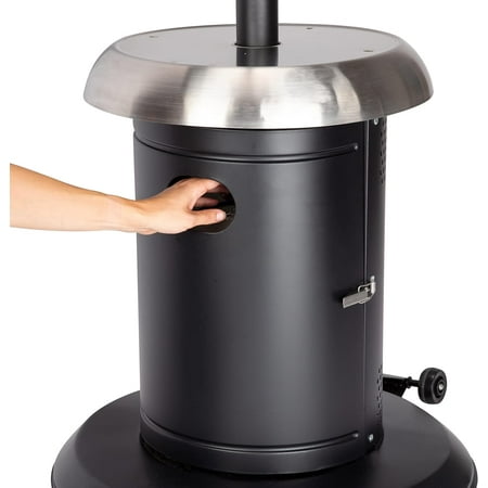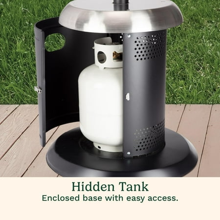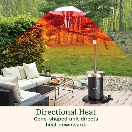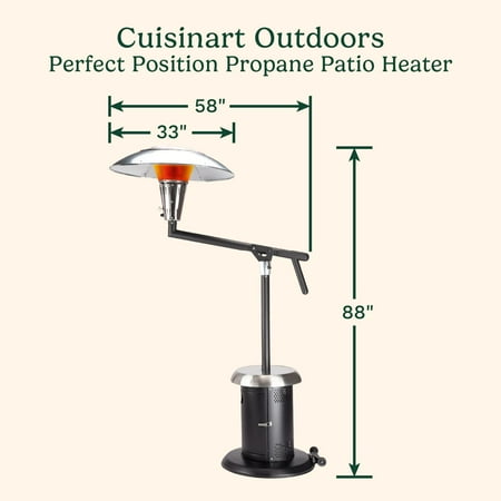 Stay warm and in control with the Cuisinart Perfect Position Propane Patio Heater, an overhead heater designed to direct heat exactly where you need it. Unlike traditional upright patio heaters, this innovative swivel-arm design lets you adjust the heat distribution from left to right, covering more space and maximizing comfort. When finished, fold the swivel arm down for compact storage. The 33” heat shield and cone-shaped burner unit direct 38,200 BTUs of powerful heat downward and outward for optimal warmth. Built for convenience, the enclosed base discreetly stores a 20 lb. propane tank and offers easy-access controls. A built-in stainless steel drink table adds functionality and style, making it a perfect addition to any patio. With a 50 lb. weighted wheeled base for mobility, you can easily move warmth wherever it's needed. Rotate, relax, and stay cozy with the Perfect Position Propane Patio Heater.