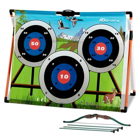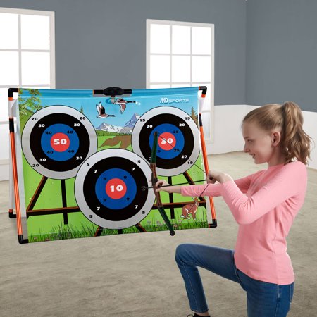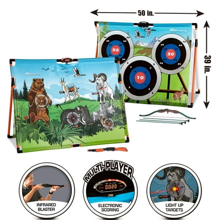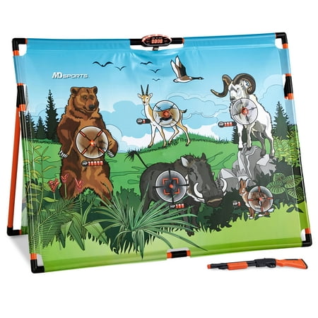 2 IN 1 HUNTING GAME Bring arcade-style archery home with MD Sports Big Game Hunting and Super Shot Archery. Extend the fun for everyone with animal hunting contests with the infrared blaster, then switch to target shooting with safety stick arrows. Practice your scoring and control on a small scale, or show your friends and family who reigns supreme. SHOOT LIKE A PRO This game is designed with two game modes for training you become a professional hunter. The standard mode is to test your reaction by hunting down five animals with light-up infrared sensor randomly in limited time. Once you ready to challenge the next level, try the advanced mode to improve your accuracy by dwindling their health points which is set up for each animal. Let?s master your skills to take the perfect shot! LED ELECTRONIC SCORER This integrated LED electronic scoring system will keep track your hunting record, health points light on top with animal sound effects increase the realistic wild hunting experience while playing. Plus, you can practice by yourself or challenge your family and friends with the multi-player option. COMPLETE SET With a full complement of accessories, your hunting set is ready to play whenever you are, all from the comfort of your own home. Each kit comes with everything you need for quick assembly and play, including a 50 x 39 inch target with sturdy construction, one infrared blaster, one bow, and three arrows. PERFECT FOR KIDS, ADULTS We design our sports equipment for all players to enjoy. Whether you're just starting to learn foosball or already a seasoned player, anyone can join in the fun and competition. Roll out the arcade for birthday parties, graduations, get-togethers, holidays, or simply whenever you want.