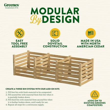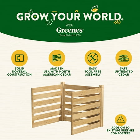 Turn your regular Greenes Composting Bin into a complete composting system with our Add-On Composting Kit. After the materials in your original composting bin begin to break down, move them to an attached add-on bin and start fresh with new materials in the first bin. A system of one Greenes Composting Bin and two add-on kits will keep your composting process moving seamlessly. It is available in (36-inch x 36-inch x 31-inch/23.25 cubic feet) to match your regular bin.