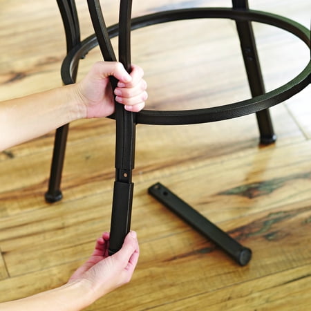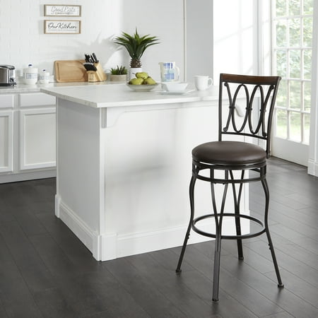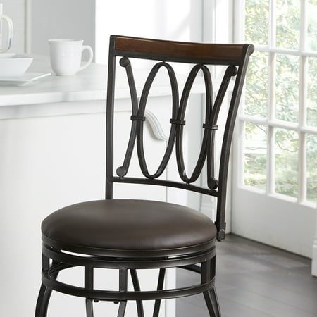 Add elegance and functionality to your lounge or kitchen bar with the Better Homes & Gardens Adjustable Barstool, Oil-Rubbed Bronze. The adjustable height feature makes this stool perfect for anyone, allowing seat height of 24" to 29". Its sturdy metal construction is painted with a textured oil-rubbed bronze finish accented with a wood trim on the seat back; that is sure to compliment the room's furnishings. The rich chocolate brown cushion seat provides great comfort. It has a 360-degree swivel, which allows you to turn around at will. The swivel bar stool's angled legs and round footrests facilitate better sitting positions and reduce stress on your knee joints. Made from high-quality metal, this adjustable bar stool is highly durable.
