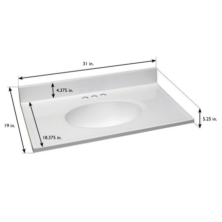 The Design House 551333 Single Bowl Marble Vanity Top features a classic white finish and the vanity bowl has a 5-inch depth and (3) pre-drilled holes for a 4-inch center mount. The cultured marble is stain resistant and measures 31-inches long by 19-inches wide. The 3-inch high back splash prevents mold and water damage by creating a physical barrier between your wall and vanity, which defends against chemicals and water. Additional side splashes can be purchased separately. The vanity has a drip free edge that's slightly lifted to contain excess water. The vanity is compliant to CSA, cUPC and ANSI requirements, ensuring the highest quality. The Design House 551333 Single Bowl Marble Vanity Top has a 5-year limited warranty that protects against defects in materials and workmanship.