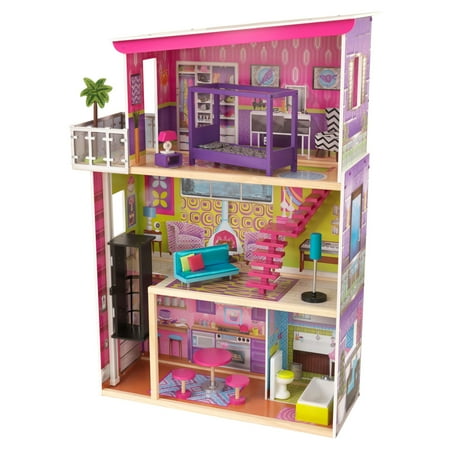 The KidKraft Super Model Dollhouse is extremely photogenic. With three floors, bold colors and fun features, the allure is noticeable right away. Its eclectic vibe is a mashup of retro and modern décor. The posh feature—a gliding elevator—lets dolls take it easy after a day of walking the fashion runway. The patio off the top level is a lovely retreat that is complete with koi pond graphics and a standing palm tree. The 11-piece furniture set lets kids decorate each of the expansive rooms. A canopy bed is the highlight of the third-floor bedroom. All 12-inch dolls will feel like they're living in absolute luxury in the KidKraft Super Model Wooden Dollhouse.
