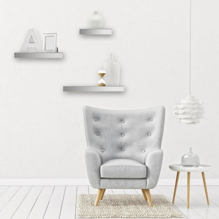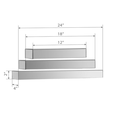 Add a touch of glam to your decor with this contemporary Mirrored Floating Shelf Set. This set of three floating ledges does more than just provide additional storage, the mirrored panels reflect and enhance each piece placed on it to showcase them beautifully. No visible screws or brackets produces a floating wall effect to highlight your home decor. This floating shelf set is a perfect accent piece for the bedroom, bathroom, entryway and more. Hardware is affixed to the back of the shelf and includes screws and anchors, so it's ready to hang right out of the box. Kit includes three mirror shelves measuring 24 inches, 18 inches and 12 inches.