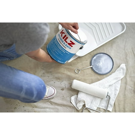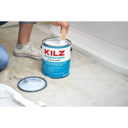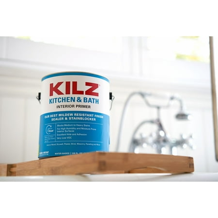 New Look, Same Trusted Formula. Seals porous surfaces, promotes adhesion, helps block light to medium stains, hides previous colors, features a mildew-resistant finish. KILZ KITCHEN & BATH Primer is a water based primer-sealer-stainblocker that is specially designed for residential surfaces in high humidity, moisture and temperature environments such as kitchens, bathrooms, powder rooms and laundry rooms. It offers excellent adhesion to most interior surfaces and provides a sound anchor for paints. The enhanced mildew-resistant film protects the primer from mildew growth. KILZ KITCHEN & BATH Primer-sealer will block most stains including felt marker, grease, ink, pencil, tannin and water stains. It is a fast drying, low odor, very low VOC* formula and is easy to clean with soap and water. *Formulated without addition of VOC containing solvent. <5 g/L VOC, excluding colorant(s).