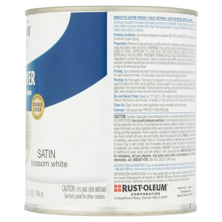 Satin Blossom White Premium Latex Paint<br><br>American Accents provides long-lasting protection and durability. This high quality formula goes on smoothly, hides better and goes further than other multi-purpose paints. Tough, chip-resistant finish is ideal for a variety of indoor and outdoor projects.
