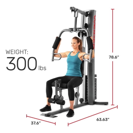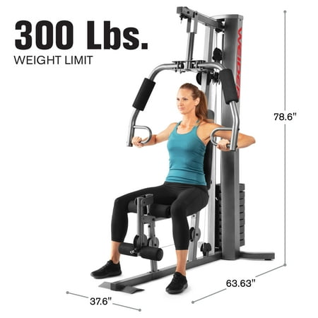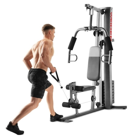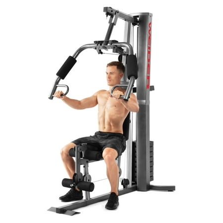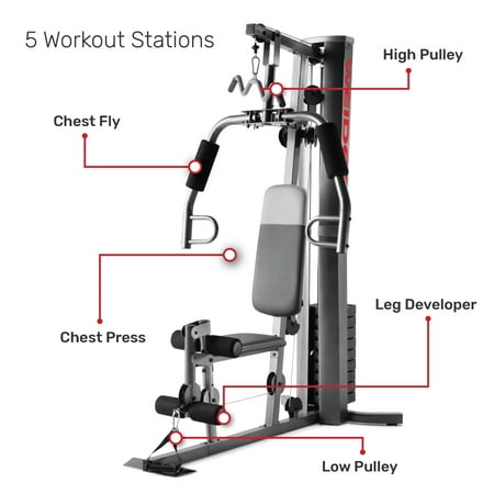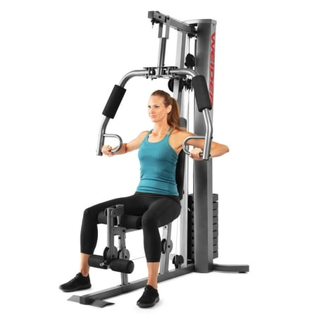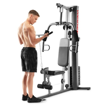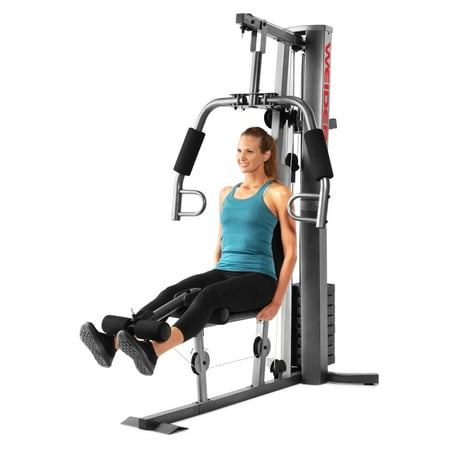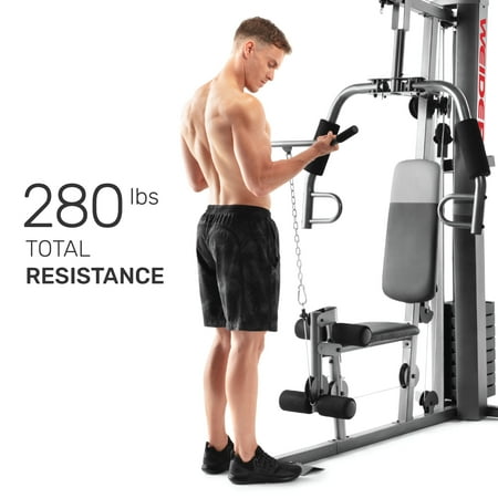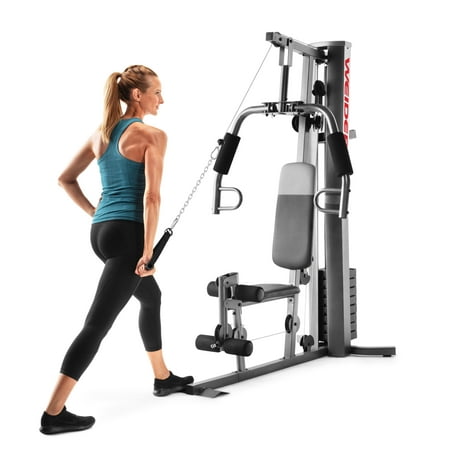 Save yourself the hassle of an annually-renewed gym membership with the XRS 50 Home Gym System from Weider. This complete workout unit includes everything you need to engage your entire body for better health and more powerful, lean muscle growth. High and low pulley systems power up to 280 pounds of resistance that can build strength across all major muscle groups in your body. A combined chest press and fly station can sculpt your pectoral muscles, and a pulldown bar enables you to engage and define your lats. A comfortably-padded 4-roll leg developer allows you to target and train your lower body; perform leg extensions to build and tone your quads and hip flexors. Manufactured with durable construction and sewn vinyl seats, this home gym system will work as hard as you do, through your most intense strength training sessions. An included exercise chart developed by a certified personal trainer illustrates proper form on a variety of exercises to enhance your results.