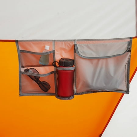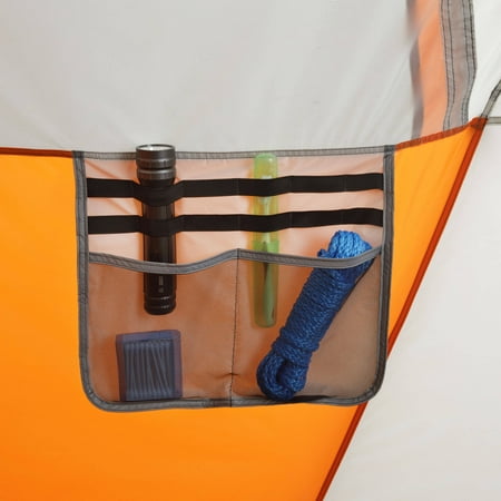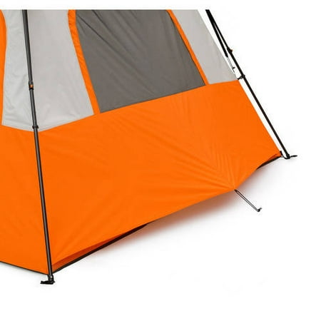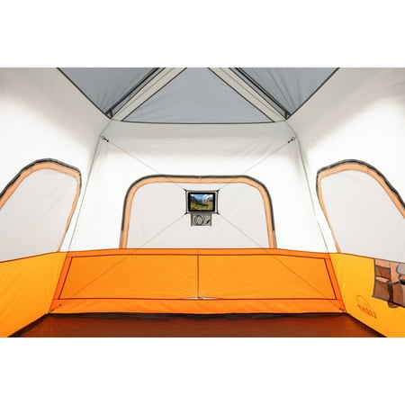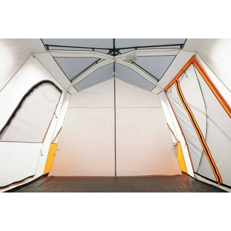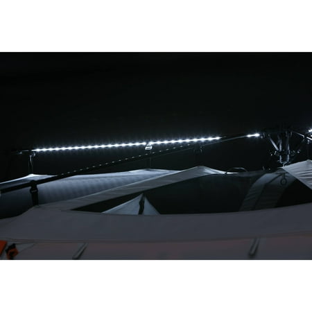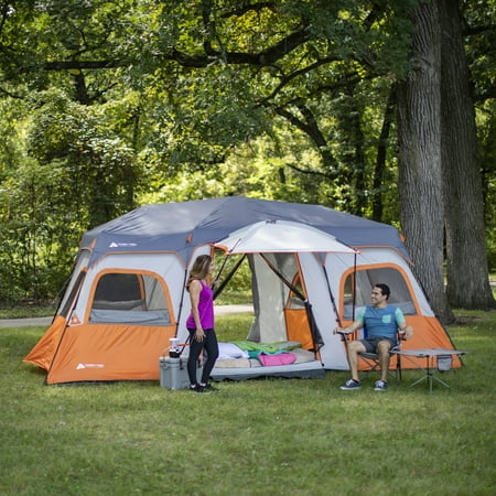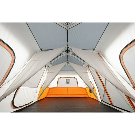 Be comfortable and safe even when sleeping in the outdoors when you have the Ozark Trail 18' x 10' Instant Cabin Tent. This model is designed to accommodate 12 adults at the same time, so you can have your entire family or group of friends under one roof. Despite its size, it is easy to set up in about two minutes and does not require any special assembly. The poles are pre-attached to the tent, so all you need to do is unfold it and extend. The ambient LED-lighted poles on the Ozark Trail Instant Tent allow for amazing light throughout the area and can be adjusted with the low, medium and high settings. It features a panoramic view with the extra-large windows and a shade porch. The provided room dividers allow you to create up to three rooms for separate living and sleeping spaces. The center height also leaves plenty of room to walk around. This Ozark Trail 12-person tent can fit three queen air beds or 12 campers in sleeping bags on the floor.