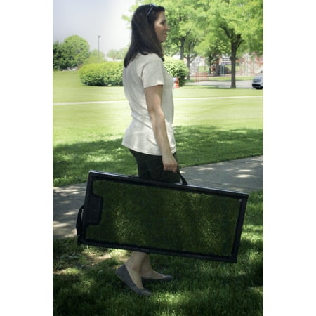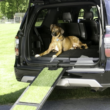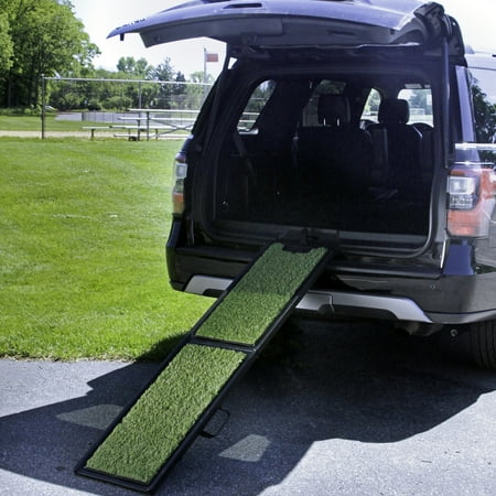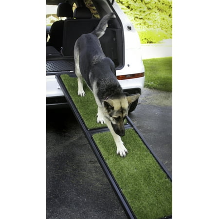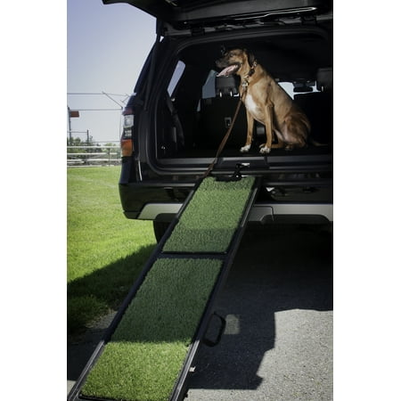 Give your pet an easier way to come inside the house or car with this Gen7Pets Green Natural Step Ramp. This contains artificial grass, which allows a dog to get a grip and feel secure while walking up a soft surface that won't scratch paw pads. The Gen7Pets ramp features a surface that is soft to the touch for a pet parent and it does not scuff or scratch the interior of a vehicle. This full size accessory measures 72" when open and 36" when folded for storage in your trunk. The vehicle pet ramp is best used with SUVs, minivans and pickup trucks. The ramp will support any dog weighing up to 250 lbs. It is 16" wide and automatically locks when folded. This will prevent the product from opening up again in a vehicle with no pets inside. Rubber grippers on the bottom provide stability and prevent the ramp from sliding all over the car's surface. You also get a soft rubber handle for carrying it to and from different locations.