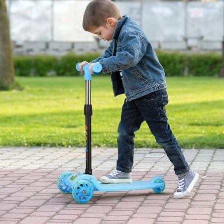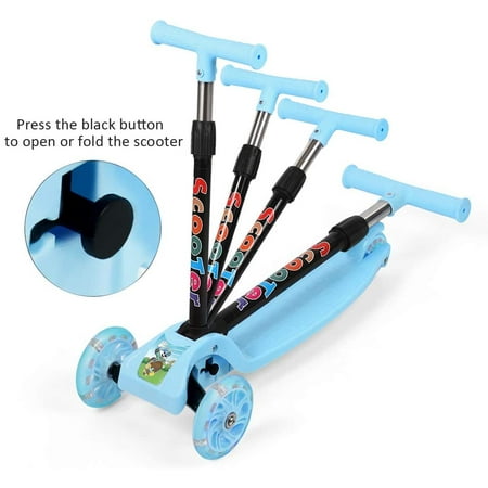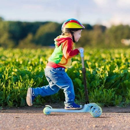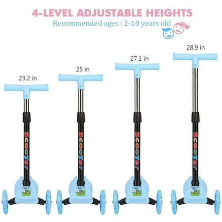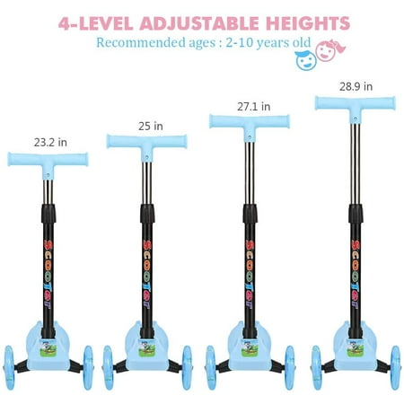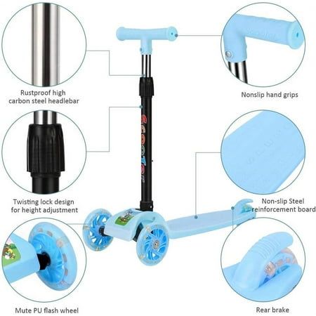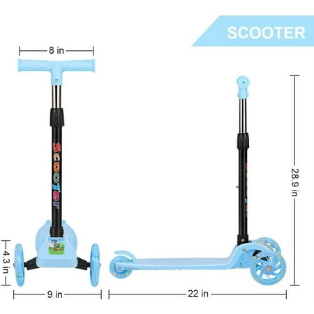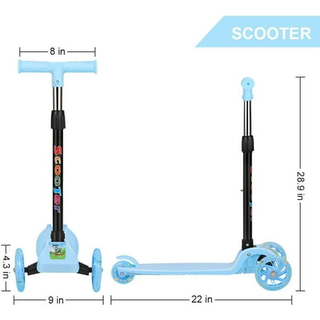 Go anywhere on this unisex 3-wheeled scooter for kids aged 2-10! Our advanced scooter features everything your kid’s love. T-bar has 4 adjustable height options to grow with your kids. It features a low-to-the-ground deck for easy scooting and added stability. Stable 3-wheel design with safe lean-to-steer mechanism, while developing the balance and coordination used in many sports activities. The smooth and quiet polyurethane wheels, low-to-the-ground wide deck and ultra-comfortable hand grip, making it the perfect companion for any outing. Our scooter is ready to take on any adventure! Specification: Color: Blue Item Dimensions: 22” x 9” x 28.9” Package Content: 1 x Scooter