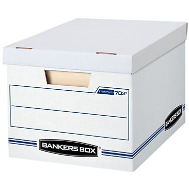 Free up space in any area using this Bankers Box File Storage. It is ideal for organizing the office, home, dorm room and much more. The lift-off-lid boxes are easy to use and can be utilized for archiving receipts, tax papers, contracts and other important documents. Pack items for moving or give the closet a makeover. Each of these white storage boxes is ideal for moderate stacking, and the durable handles make them easy to transport. They measure 12"L x 10"W x 15"H and are available in a convenient 10-pack of file storage bins, so there are plenty to get the job done. These easy-to-assemble boxes will simplify work tasks and streamline any living or workspace. Store them in a closet or under the bed or stack them in the garage for more floor space. Students will find the Bankers Box File Storage helpful at the end of the semester when it is time to transfer.