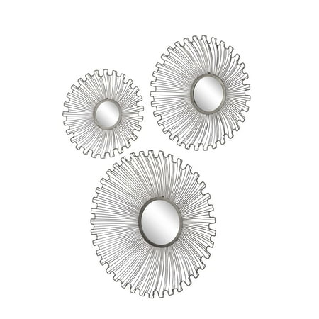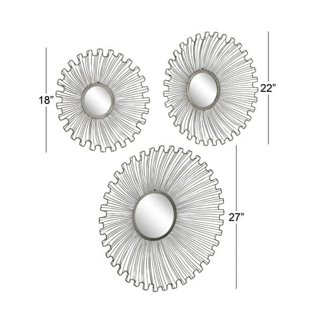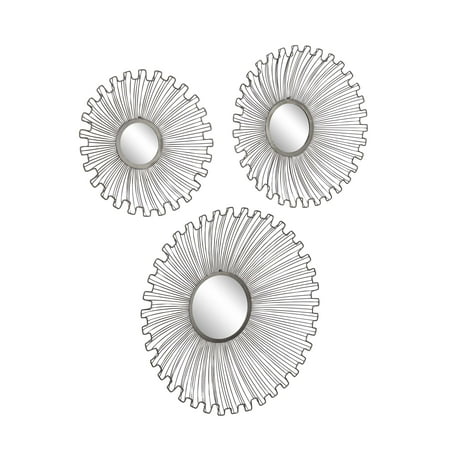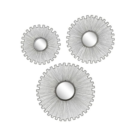 An industrial twist on the mod sunburst mirror, the DecMode Tin and Glass Sunburst Wall Mirrors - Set of 3 adds a rugged touch to interiors. Each of the three mirrors is crafted out of tin and is simple to hang.