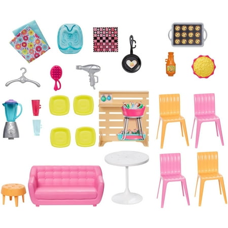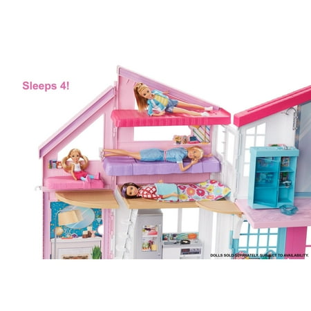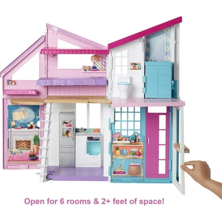 The Barbie Malibu House playset is ready for imaginations to move right in with cool transformations and lots of storytelling pieces! The Barbie dollhouse opens to reveal so many play spaces and double-the-fun features. Kids can make the 2-story, 2-foot wide dollhouse their own with more than 25 pieces to decorate its 6 rooms transformation elements bring even more possibilities into the playset. The living room transforms to an entertainment room, the shower becomes a vanity and the ceiling becomes a bunk bed to make room for 4 Barbie sisters to sleep. Classic features are there, too: the bathroom has a toilet with sink and shower; the fridge and oven open in the kitchen; and a fence piece sports a grill decal to bring the play outside. The doll-sized furniture and accessories include classic items with signature style, like a pink couch or white circle dining table, and smaller pieces that add big fun, like place settings and a gameboard. Some pieces have a handle a doll can hold (sold separately) and/or are designed with plug-and-play features that make it easy for active play or quick clean up. Fold the house to store away with ease. Tell stories where Barbie doll is hanging with her sisters, having sleepovers or backyard BBQs, celebrating a birthday, holiday or any day! There are endless stories to tell and limitless ways to explore living in the Barbie Malibu House because when a girl plays with Barbie, she imagines everything she can become! The Barbie Malibu House comes with 25+ accessories that include furniture and household items; doll not included. Colors and decorations may vary.