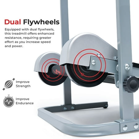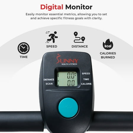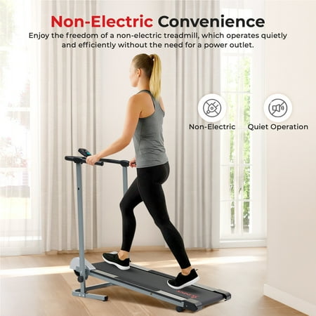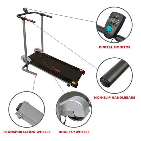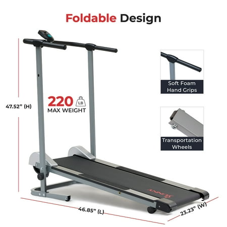 Begin your fitness journey and start walking on the SF-T1407M Manual Walking Treadmill by Sunny Health and Fitness. Improve health as you walk on the treadmill that requires no plugs or electricity. Simply get on and go! Hold onto the soft foam hand grips which allow you to maintain balance as you walk on the slight fixed incline. The incline helps move the treadmill as you walk while also giving you a subtle challenge during walking. The compact walking treadmill is excellent for small studios or apartments. Dimensions: 49L X 23W X 50H in. The small treadmill can be easily folded and rolled away into a closet or from room to room. Folded Dimensions: 20L X 23W X 50H in. The benefits of walking include increased blood circulation, strengthening of bones and muscles, and an improvement in balance, mood, and coordination. After you complete your cardio session, simply step off using the non-slip, gripped side railings. Keep track of all your fitness progress with the digital monitor. The fitness monitor tracks time, speed, calorie burn, steps, and scan. The sturdy frame supports a max weight of 220 lbs. Health and wellness are just steps away with the SF-T1407M Manual Walking Treadmill by Sunny Health and Fitness.