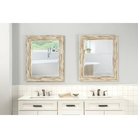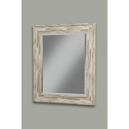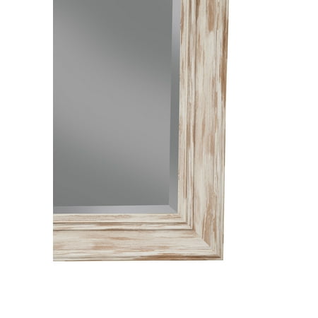 The worn Antique White Wash finish of the Farmhouse Mirror Collection adds timeless country style and rustic flair to any room in the home. The frame's antique finish is reminiscent of an old weathered barn. The beveled glass adds a touch of softness to the overall look of the mirror. Perfect to be used as a wall mounted mirror for the living room, bedroom, entryway, hallway, or bathroom. D-ring brackets are attached to the back for easy wall mounting without the use of a wire. Overall Dimensions measures 36 inches high x 30 inches wide x 2 inches deep; Glass surface measures 28 inches high x 22 inches wide. Product materials: Glass, Polystyrene.