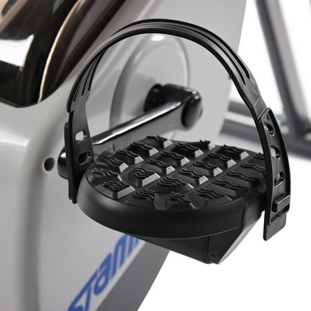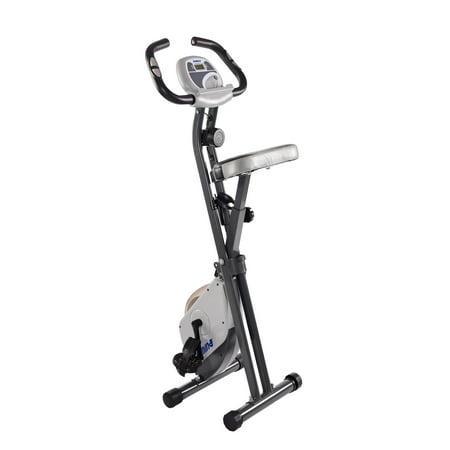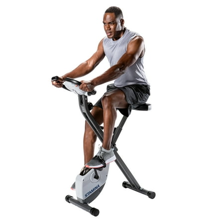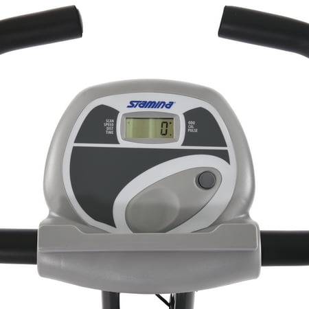 Get the calorie-burning workout you need without having to leave the house with the Stamina Cardio Folding Exercise Bike. With quick and easy assembly, you'll be able to begin cycling soon after you get home. Once you're riding, you'll see how the wide, padded, upholstered seat makes long cycling sessions enjoyable. Plus, you'll be able to read, listen to music and watch TV while riding. With the help of the Stamina cardio bike's two holders, you get everything you need to achieve a fun workout. It's outfitted with eight levels of smooth, quiet, magnetic resistance, curved handlebars and textured pedals. You can also track your performance with the multi-function monitor, which displays the distance, calories burned and more. This Upright cardio exercise bike offers a space-saving, convenient option for those who don't have a dedicated workout area. Weight limit 250 lb.