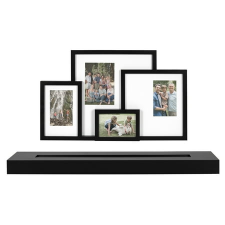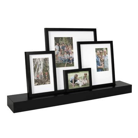This Mainstays Photo Collage with Shelf Set includes one float shelf and one 4-opening picture frame. This matching combination makes it easy and affordable to decorate your home. Showcase your favorite photos in the simple yet elegant collage that let your photos be the star attraction. The collage frame holds three 4" x 6" photos and one 5" x 7" photo. Its smooth, simple and clean lines are great for displaying your favorite memories of your kids, grandkids, pets and special occasions such as weddings, birthdays and more! The collage frame includes a sawtooth hanger for hanging the frame on a wall if you prefer to not rest it on the included shelf. The float shelf is seamless addition to your decor - it has a recessed notch on the top surface for the collage to sit in. Hanging is made easy with the attached keyholes and sawtooth hangers. The shelf and collage frame display horizontal on the wall. Made of plastic. Mix and match this set with other Mainstays frames to complete your photo wall gallery. It also makes a great gift to give a loved one for birthdays, housewarming parties, weddings, anniversaries, and more.