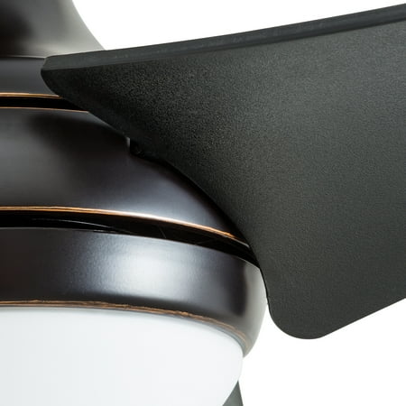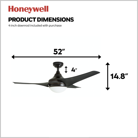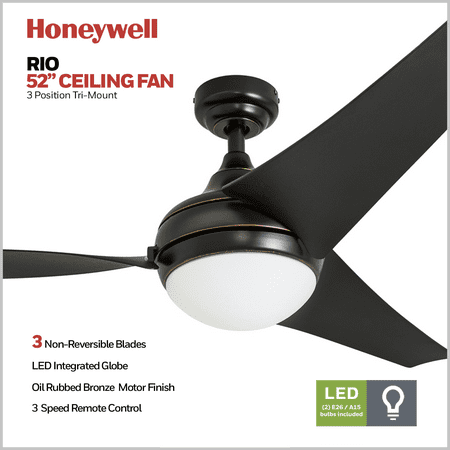 The 52-inch Honeywell Rio brings a very Zen approach to modern and contemporary ceiling fan collections. The richness of the brushed bronze and the depth in the blade finish embody a warm and holistic allure. Offering exceptional airflow circulation, the progressive pitch of the Rio makes your living area or family room ideally cool throughout the summer months. Being designed with a reversible motor, warmer air can be redistributed as well making your space more comfortable during the winter. This fan is energy-efficient, easy to install and comes with 3 different mounting options - close, standard, or angled. The Honeywell Rio offers a timeless look and adequate air flow that you can rely on for years to come.