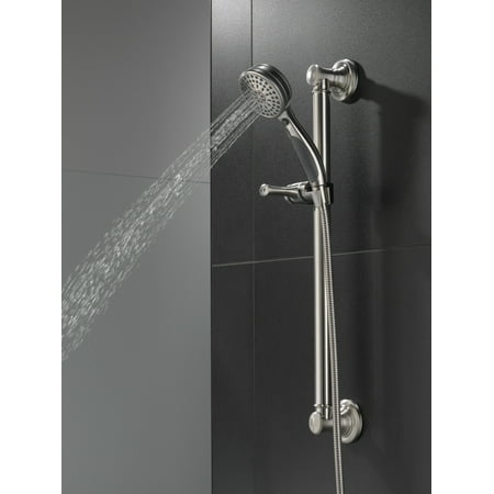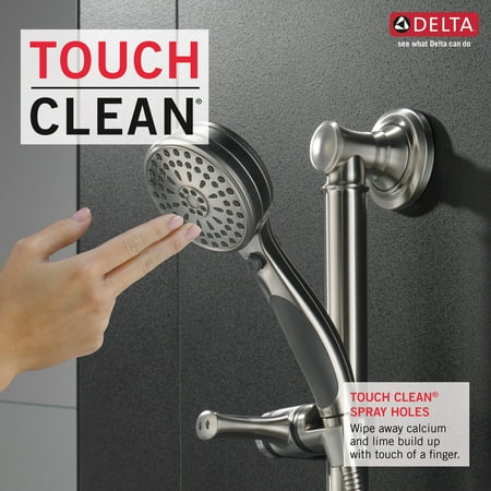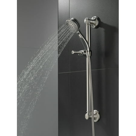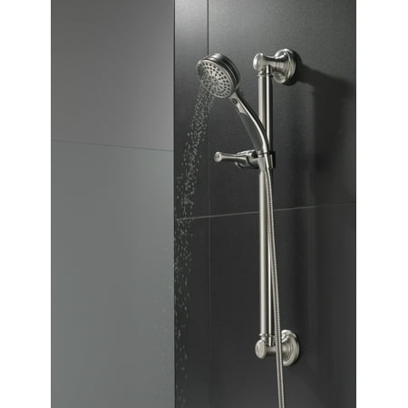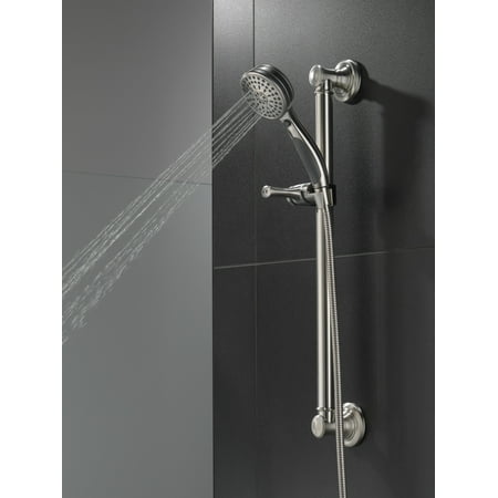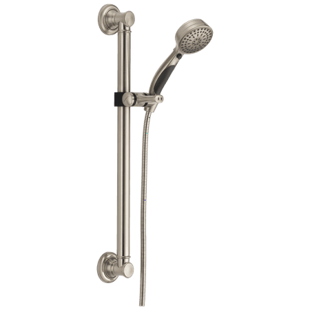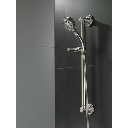 Delta® Decorative Grab/Slide Bars are ADA Compliant. They can be positioned 33 to 36 inches above the finished floor. The bars do not rotate within the fittings and will support up to 500 pounds of force, twice the ADA requirement of 250 pounds of force, when properly installed. A retrievable grab/slide bar wall anchor is also included for ease of removal. Delta is committed to supporting water conservation around the globe and has been recognized as WaterSense® Manufacturer Partner of the Year in 2011, 2013, and 2014. With three spray-selection buttons and a pause feature that allow you to choose up to nine spray settings with a simple, one-handed activation, the ActivTouch® hand shower delivers a new level of innovation to enhance the showering experience. The ActivTouch offers a non-slip, ergonomic grip to help prevent the hand shower from slipping out of the hand while in the shower. The 60?-82? stretchable stainless steel hose option offers maximum flexibility. The impact-resistant spray face offers durability for years to come while the internal double-check valve offers peace of mind with back-flow protection. Innovative Pause feature allows you to conserve water while lathering up.