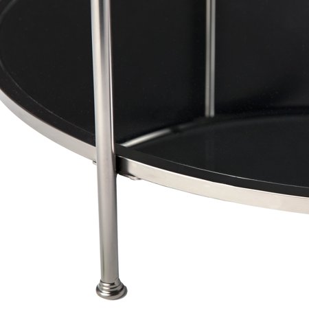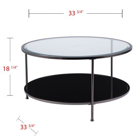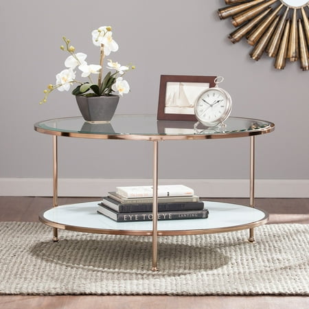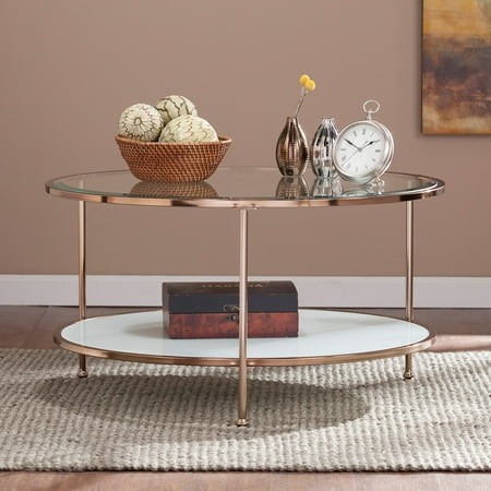 Part-vintage and part-industrial, the Southern Enterprises Risa Cocktail Table adds retro glam to your living room, den, or home office. The design, inspired by 1920s styles, features a tripod base with an oval wide-beveled clear glass top and a glass shelf below. The cocktail table is crafted of metal and glass and available in a choice of finish.