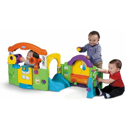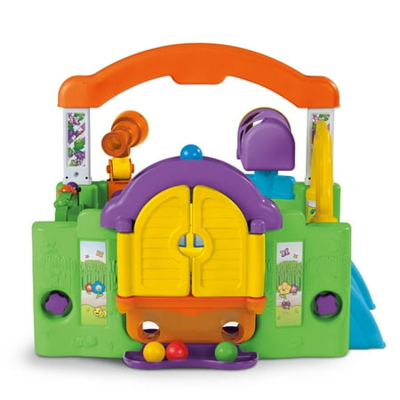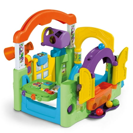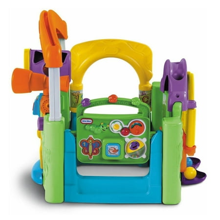 The Little Tikes Activity Garden easily converts from a closed play center to an open, two-sided play center without tools to grow with your child. The removable take-along play panel features a bead tumbler, mirror, spinning "gears," and even plays music. The window shutters open and close to play a game of peek-a-boo. For more fun games, use the window planter for ball drop play. The mailbox allows children to pretend to receive 'mail' as well as learn shapes and colors. The Tap-a-TuneĀ® Piano has colored chimes and buttons to encourage your child to experiment musically.