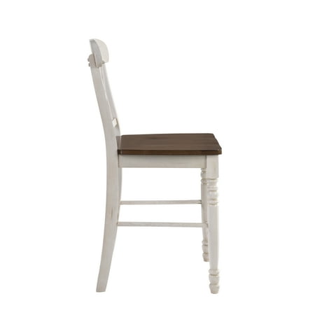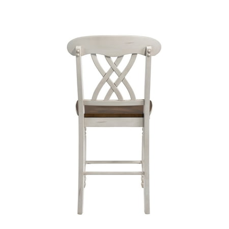 The charming Dylan counter height chairs come in an enchanting two-tone finish and features graceful carvings sure to give your favorite gathering space an elegant look. Each chair is made of solid rubberwood with flared back legs and turned front legs connected by stabilizing stretchers. The angled backrest flaunts an overlapping X design topped by a contoured crown that supports the shoulders. Dark oak seats are carefully scooped for added comfort.17" seat depth. 24" seat height. Set of 2.