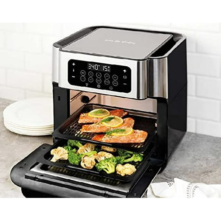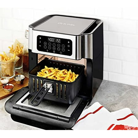 Save calories and cut unwanted fats when you prepare healthier versions of all your favorite foods using our Sur La Table Multifunctional Air Fryer. This multifunctional air fryer uses 1700 watts of power to deliver 360 Airflow Technology to quickly prepare tender inside, crispy outside air-fried foods such as fries, onion rings and wings with little to no oil required. Air fry, rotisserie, bake, roast, broil, reheat and dehydrate with 10 pre-set buttons for easy, one-touch operation. The 13 quart capacity allows larger batches for family meal prep or cooking for a party. Easy to follow delicious video recipes and recipe book provide easy guidance and tasty ideas. Product Features: Air fry, bake, roast, dehydrate, rotisserie, reheat and broil Easy to follow video recipes and recipe book included LED digital display panel with automatic shut-off Interior lighting 360° airflow technology XL window for easy viewing Extra-large easy-grip handle 1700 watts of power