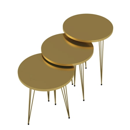 IDEAL SIZE FOR SMALL SPACES: Fits in your space, Fits in your budget. The perfect size and height are ideal for sofa, chair, bedside as end table, night stand, side table, coffee table and tea table, indoor and outdoor. Practical for the additional need of storage and display. Lightweight design and ideal size, easy to move and carry. Set of 3 Nesting Tables Dimensions: Large one: 15.3” diameter x 21.2” height - Medium one: 15.3” diameter x 19.6” height - Small one: 15.3” diameter x 18.1” height HIGH QUALITY & MODERN DESIGN: Strong and sturdy small tables are made of high-quality wood material and metal legs. Gold Round Stacking Nesting Tables have elegant high gloss look, durable performance, affordable and non-toxic function. Supports up to 150lb. Anti-slip plastic pad on the bottom of coffee table legs makes it more stable and prevent scratches to the floor. Round design can be placed in corners to save space. Rounded edge design can prevent potential damage and injuries. MULTI FUNCTION: Portable space saving nesting stacking tables can be used as functional side table, sofa table, couch table, accent table, coffee table, tea table, plant stand, speaker stands, reading table, corner table in living room dining room and balcony, lamp table, bed side table, and stands for living rooms and bedrooms. EASY ASSEMBLY & CLEAN: Easy to assemble in a few minutes, including all hardware components and instructions. You can easily clean with cleaning cloth the smooth and waterproof surface. BUY WITH CONFIDENCE: Designed and manufactured by PAK FURNITURE. The trusted source for stylish furniture for every budget. We offer 1 month money back guarantee. If you are not satisfied for any reason you can return it for a full refund, and you will have nothing to lose.