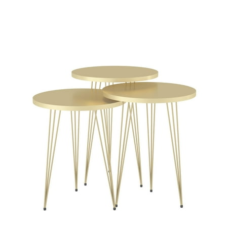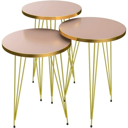 IDEAL SIZE FOR SMALL SPACES: Fits in your space, Fits in your budget. The perfect size and height are ideal for sofa, chair, bedside as end table, night stand, side table, coffee table and tea table, indoor and outdoor. Practical for the additional need of storage and display. Lightweight design and ideal size, easy to move and carry. Set of 3 Nesting Tables Dimensions: Large one: 15.3” diameter x 21.2” height - Medium one: 15.3” diameter x 19.6” height - Small one: 15.3” diameter x 18.1” height HIGH QUALITY & MODERN DESIGN: Strong and sturdy small tables are made of high-quality wood material and metal legs. Gold Triangle Stacking Nesting Tables have elegant high gloss look, durable performance, affordable and non-toxic function. Supports up to 150lb. Anti-slip plastic pad on the bottom of coffee table legs makes it more stable and prevent scratches to the floor. Round design can be placed in corners to save space. Triangle edge design can prevent potential damage and injuries. MULTI FUNCTION: Portable space saving nesting stacking tables can be used as functional side table, sofa table, couch table, accent table, coffee table, tea table, plant stand, speaker stands, reading table, corner table in living room dining room and balcony, lamp table, bed side table, and stands for living rooms and bedrooms. EASY ASSEMBLY & CLEAN: Easy to assemble in a few minutes, including all hardware components and instructions. You can easily clean with cleaning cloth the smooth and waterproof surface. BUY WITH CONFIDENCE: Designed and manufactured by PAK FURNITURE. The trusted source for stylish furniture for every budget. We offer 1 month money back guarantee. If you are not satisfied for any reason you can return it for a full refund, and you will have nothing to lose.