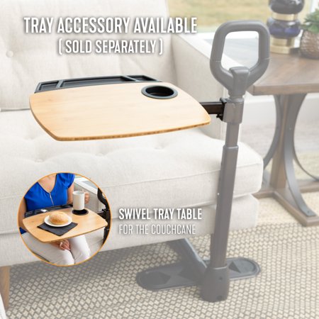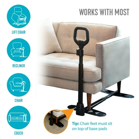 It helps to provide balance and support when sitting or standing from your favorite chair. The Couch Cane is perfect for anyone who lacks mobility, suffer from loss of balance or are recovering from an injury or surgery. The ergonomic cane grip safety handle supports up to 250 lbs and provides needed leverage to lift yourself out of a living room chair, sofa, recliner or lift chair. The grab bar works great for seniors, elderly, injured, physical therapy and the disabled. When not in-use, the discrete mobility aid blends in with the home like another piece of furniture. The included 4-pocket organizer pouch of the Couch Cane can be used to store glasses, remotes, phones and other personal items close to you. The saddle bag helps to prevent a loss of balance when over-reacting to a side table. The couch cane chair lift is fully adjustable to fit most couches, chairs, easy chairs and lift chairs. The base pads sit underneath the chair legs and are adjustable in length to fit most seat sizes. The height of the support handle can be modified to your individual comfort and furniture design. If you or someone you know struggles to get up from their favorite chair, the Couch Cane from Stander is the perfect mobility device to help them achieve greater independence. Please reference our product infographics to determine if the Couch Cane is compatible with your furniture.