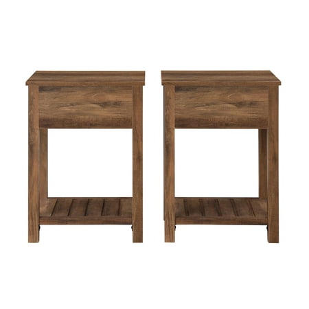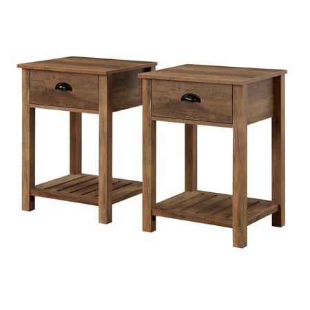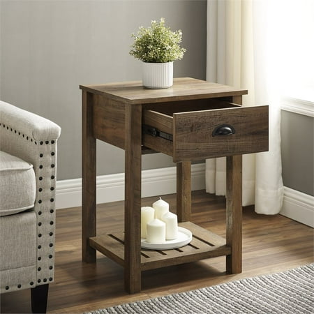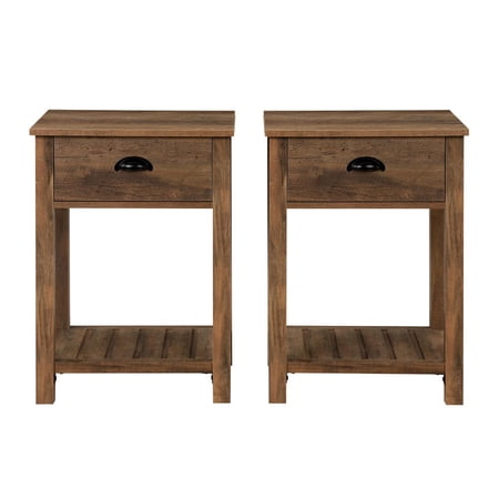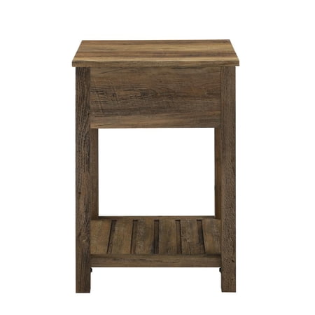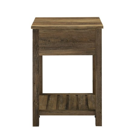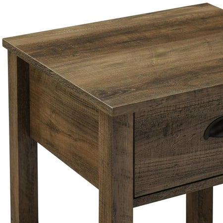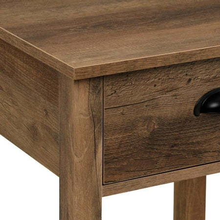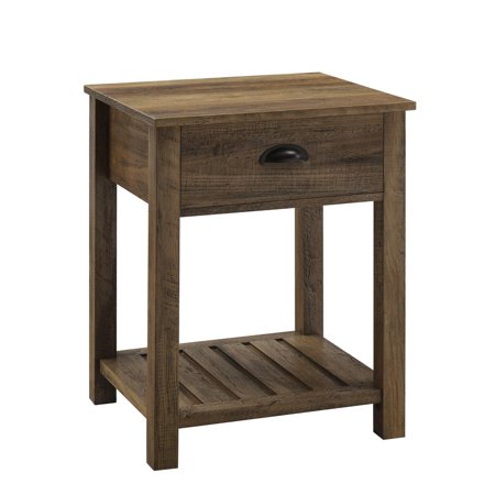 Whether you’re looking to keep things quaint and country or simply organize your home, this one-drawer farmhouse nightstand will satisfy your design desires. The single top drawer with a cup handle features telescoping metal drawer glides for a smooth push and pull track for convenient closed storage. The lower slat style shelf creates open storage while infusing farmhouse style. Use this accent table in the living room or home office for some sneaky storage. Pair with the matching entry table to make a complete set in your home. Features : Color: Rustic Oak 1 drawer farmhouse style end table Painted metal half circle handle Open and closed storage Lower slat style shelf Telescoping metal drawer glides Ships ready-to-assemble with step-by-step instructions Specifications : Nightstand Dimensions : 25.25"H x 18"L x 15.75"W Product Weight : 32 lbs