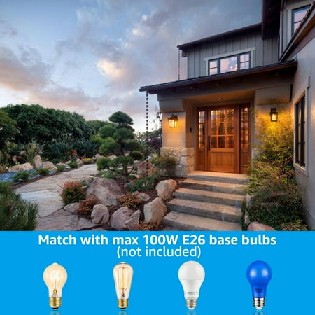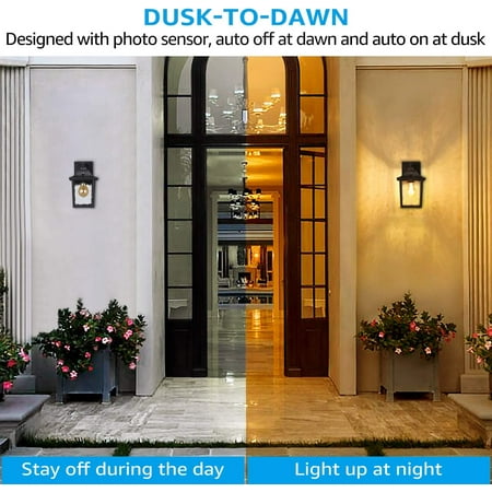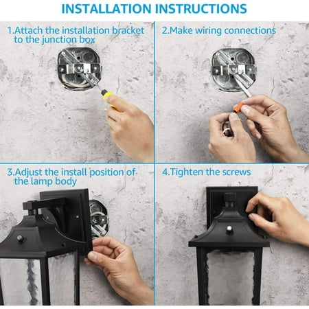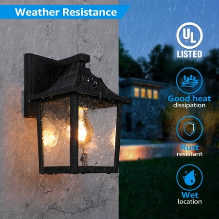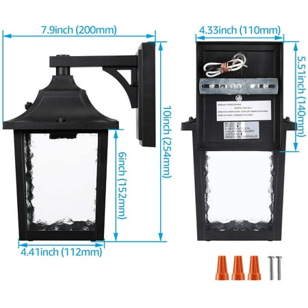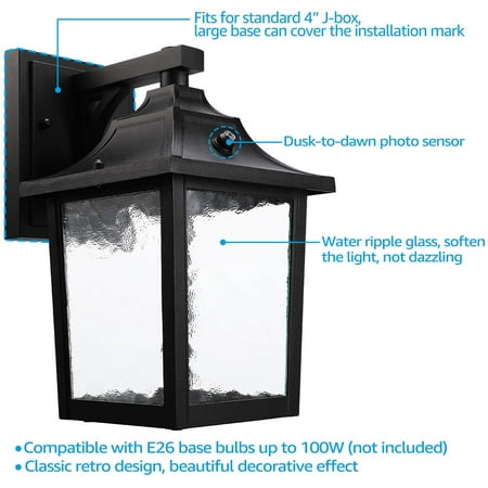 Ideal Decoration Choice This wall lantern is designed with a water ripple glass shade, which can effectively soften the light and provide you with anti-glaring lighting. It works with a max 100W bulb (not included) with E26 base and the wall lantern can automatically turn on when dusk comes and automatically turn off when dawn draws with its built-in photocell. It lets you get rid of manual control and you don't need to be afraid of energy wasting when you forget to turn off the lights. Wide Application If you are troubled by the ugly trace that your previous light leaves, then this wall lantern can help you solve it. This wall lantern has a bigger 5.51 inches(L) × 4.33 inches (W) wide base, which can cover your original light's installation trace. And the light is UL listed for high quality and safe operation, you can feel no worry when using it. It can be widely used for gardens, courtyards, porches, courtyards, exterior walls, gardens, building entrances, etc.