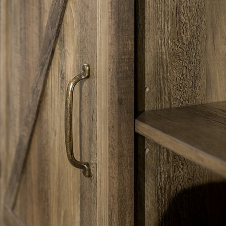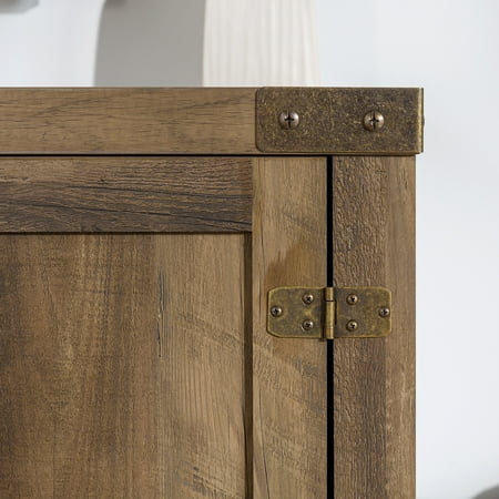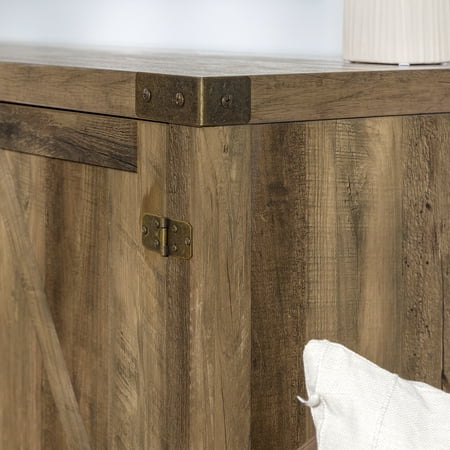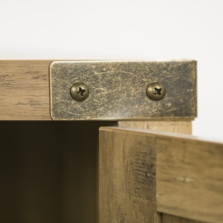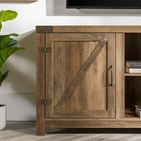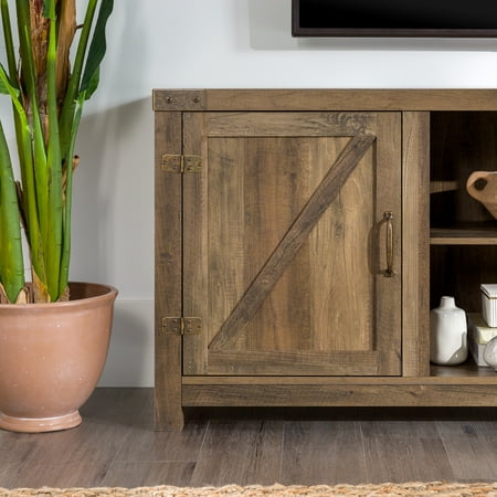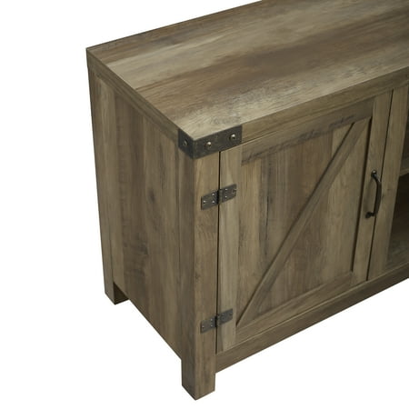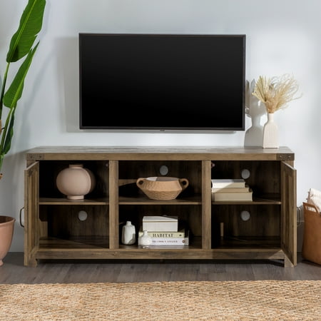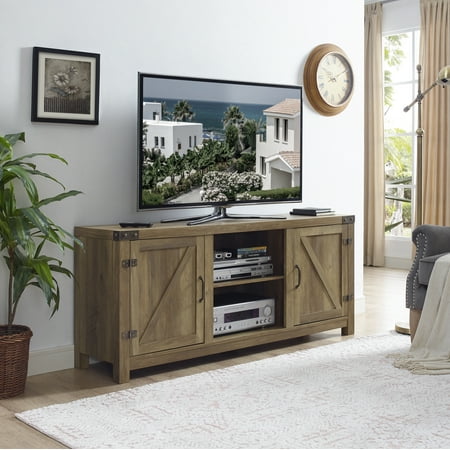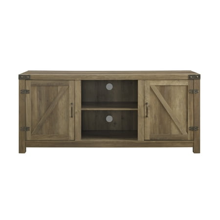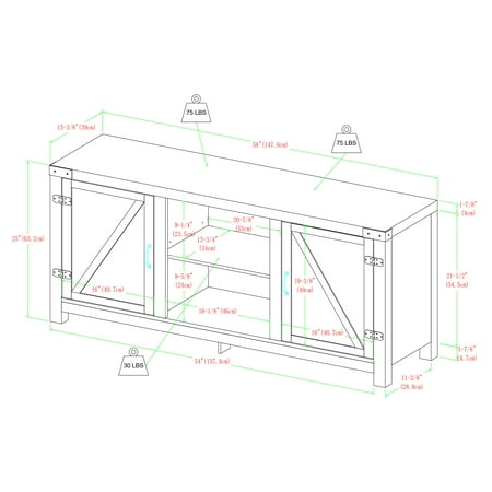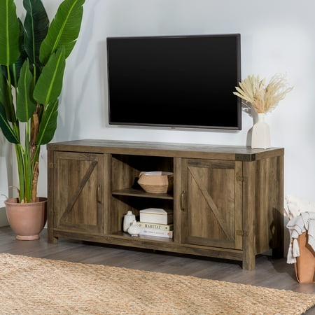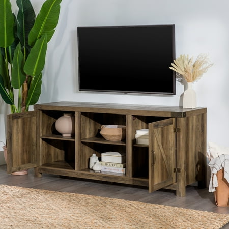 Offer up extra storage space in your home with this storage console from Manor Park. Include our rustic barn door style TV stand in your home to not only enhance the decor of your living area, but create ample storage for all of your media, accessories, and more. This entertainment center is made of durable, high-grade MDF and can support most TVs up to 65 inches. As a storage console, it will keep your living room looking neat while also giving it a homespun feel. This Barn Door TV stand in your living room will bring a charming, country feel. Features concealed storage space behind the barn styled side doors with adjustable shelving to fit your media and accessories, while having a mix of rustic and modern farmhouse style. It's the perfect addition that will keep your living room looking neat and give it a homespun feel. Dimensions: 58 inch W x 16" D x 24" H Weight: 87 lbs.