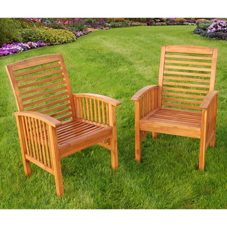 Add some comfort and style to your outdoor living space with these acacia wood patio chairs with cushions. Acting as a stand-alone piece or as a complement to wood dining sets, this pair of matching chairs is an ideal addition to almost any patio or intimate outdoor setting. Constructed from solid acacia hardwood, each chair is stylish and naturally sturdy. They are also weather-resistant for outdoor use. The wood chairs with cushions come in a set of two and they have a natural wood finish and comfortable tan cushions. In addition, the pair comes complete with hardware, tools, and instructions.