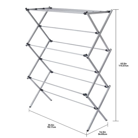 The Mainstays Oversized Collapsible Steel Laundry Drying Rack allows you to maintain the quality of clothes too delicate for dryers. Featuring seven levels for drying a wide variety of clothing at the same time, this rack is oversized to handle larger garments and laundry loads and constructed of sturdy steel for strength and durability. The rack is collapsible to make storage when not in use a snap. Lightweight at only 4.62 pounds, its simple to transport from the laundry room to the bedroom, other rooms, and back again easily. The Mainstays Oversized Collapsible Steel Laundry Drying Rack is quickly assembled with the included instructions and no tools required for a drying option to make your laundry days simple.
