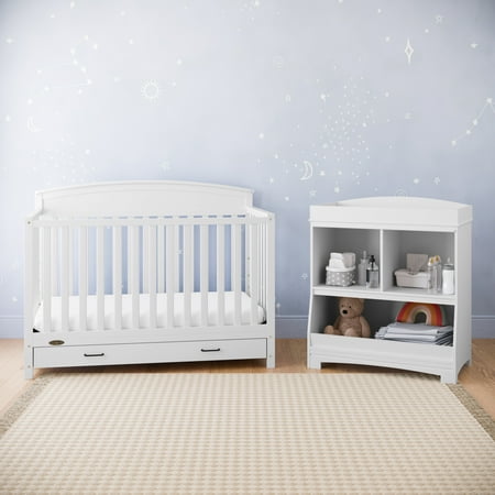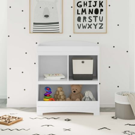 Introducing our Graco Benton Changing Table with Storage and Removable Topper. Featuring ultimate nursery storage in a classic, universal look. The Benton has multiple, spacious compartments to keep your nursery organized. The Benton features 2 storage cubbies and a large, spacious storage bin on the bottom. The Benton is GREENGUARD Gold Certified and JPMA Certified. Designed to adapt to your growing child, the Benton's changing topper can be removed when your child has grown. Pair with the Graco® Premium Contoured Changing Pad. Graco is the proud recipient of the 2022 Women's Choice Award for 9 out of 10 Recommended Baby & Kids Furniture. Graco is also the proud recipient of the PTPA Seal of Approval. Assembly required. Graco® Premium Contoured Changing Pad sold separately. Available in White and Pebble Gray.