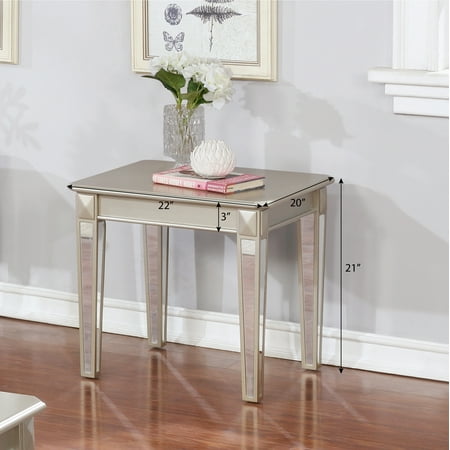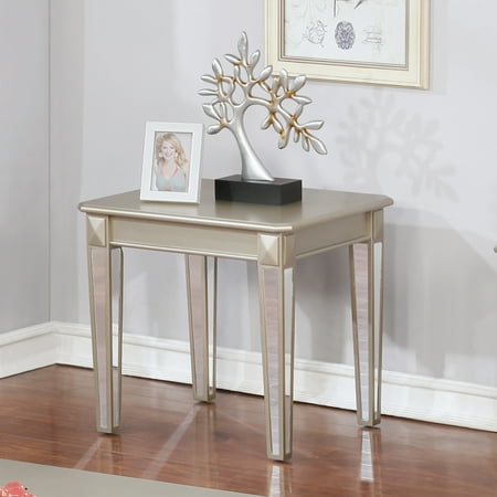 Perfect for holding your drinks, the Barent Contemporary Wood End Table with Mirrored Legs has a sleek, contemporary style that will go with just about any living room decor. It has a sturdy wood top to ensure durability, in an elegant champagne finish. Its style is really brought out with mirrored finish on the tapered legs. It'll sure to be an eye-catching piece by the side of your chair. This end table comes with detailed assembly instructions.
