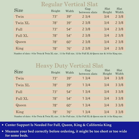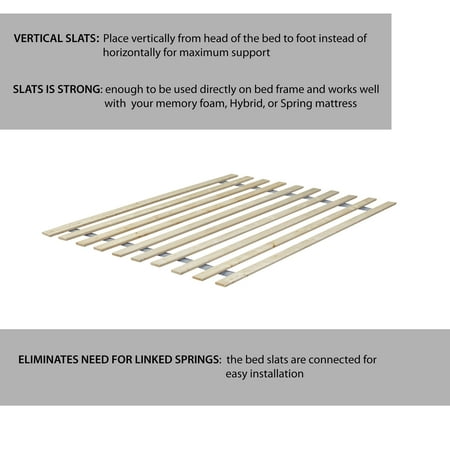 The standard wooden slats provides an excellent surface foundation for any platform beds, bunks and daybeds. It adds support to any mattress type and will keep mattress stay in good shape thus extending the life of your mattress The wooden slats made out of Black Spruce wood are linked to prevent movement during use and they effortlessly extend your mattress's life span and prevent sagging It will give a firm Bottom support for the mattress These can be avoided with the use of slats Using slats doubles the mattress' Life expectancy These slats is a good alternative in lieu of a box spring that may be too high for day beds It will give the bed a lift without adding much Height These slats is strong enough to be used directly on bed frame in lieu of a box spring.