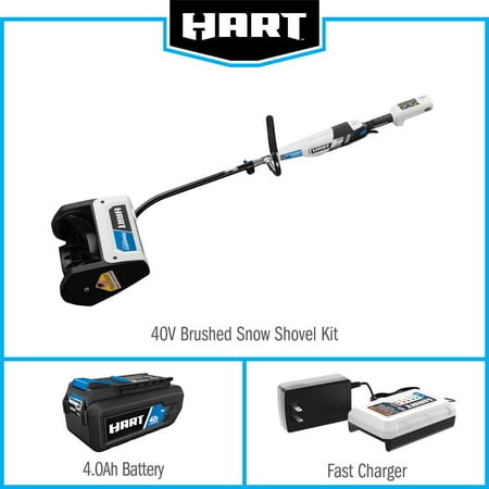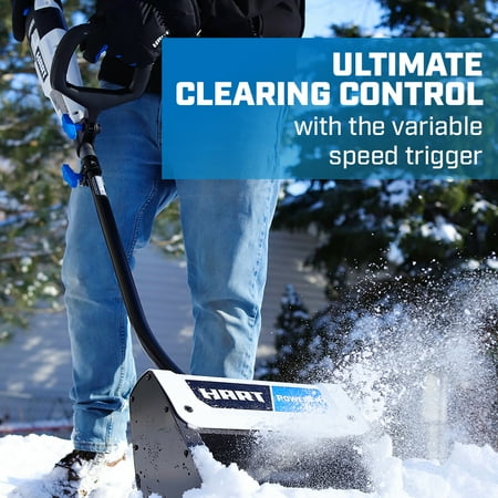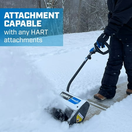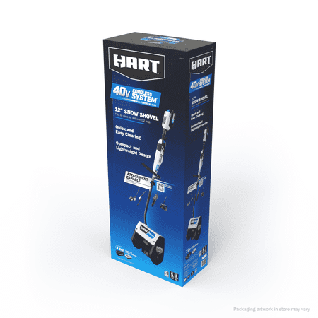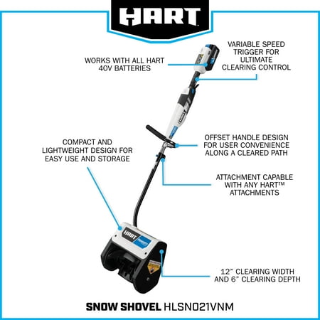 Take back your paved sidewalk, driveway, and deck during the winter months with this 40V 12” Snow Shovel from HART. This cordless shovel is capable of clearing a 12” wide by 6” deep path and can throw snow 15’ away. The variable speed trigger allows you to power through piles of snow for extended runtime. It’s cordless, compact, and lightweight so that you can work anywhere as long you need to without fatigue—and stores easily when the job is done. Attachment capability allows you to add HART’s PowerFit™ attachments (sold separately), saving you time, money, and space. Equipped with a 40V 4.0Ah battery and charger, you can use the same 40V battery on any other HART 40V tool. Powered by HART 40-Volt Lithium Ion Batteries.