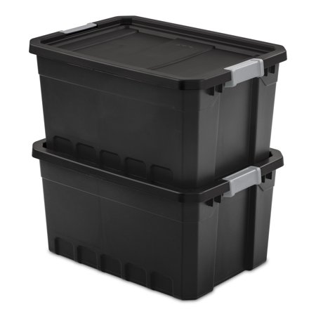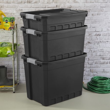 Sterilite’s 19 Gallon Modular Stacker Bin with lid brings a whole new level of organization to garages, basements, and attics! The durable storage container is built for challenging environments, and the opaque plastic bin conceals contents for out-of-sight storage. Robust, rugged latches keep the bin with lid secure during transport and stacking, while the textured surface ensures a comfortable grip. Deep recessed lids provide stability for stacking to make efficient use of vertical storage space. This size is perfect for storing bedding, seasonal clothing, sports gear, and camping supplies, delivering durable, modular storage you can count on. The overall assembled dimensions of this item are 25 3/4" L x 18 3/8" W x 13 1/4" H.