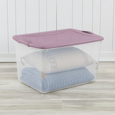 Step up to Sterilite’s 66 Quart Clear Latching Storage Bin with Lid and get organized! The clear base and lid allow you to easily view and locate stored contents from any angle. Color-accented latches securely attach the lid to the base, keeping items contained while providing a comfortable grip for easy carrying. The recessed lid design allows storage bins to stack neatly, maximizing vertical storage space. This plastic storage container is perfect for clothing, boots, sporting gear, and more, helping bring order to closets, bedrooms, and dorm rooms with ease.
