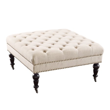 The Isabelle Square Ottoman is a stylish and versatile addition to your home's décor. Perfect for use as an ottoman or coffee table, the piece has a tufted top upholstered in a natural linen fabric. Burnished Bronze nailheads accent the side, while turned dark espresso finished legs complete the piece. Features: Crafted from Birch, Fabric, CA Firefoam and Metal Casters Dark Espresso Finish Natural Linen Beige Upholstery (100% Polyester) Burnished Bronze Nailheads Chic, sophisticated square design Tufted Top Specifications: Assembly Required: Some Assembly Required Product Dimensions: 34.63"w x 34.63"d x 17.72"h Product Weight: 30.87 lbs Seat Height: 17.72" Seat Dimensions: 34.63" x 34.63" Weight Capacity: 275 lbs