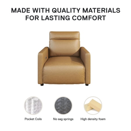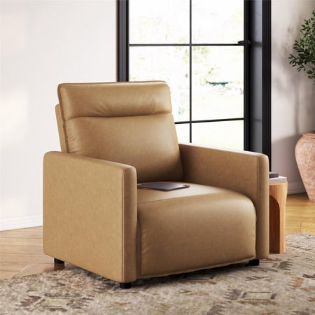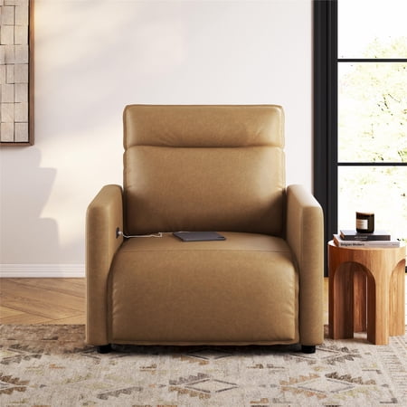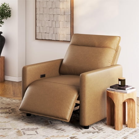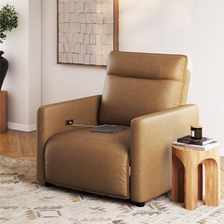 Relax in style and comfort with the Mainstays Williamson Upholstered Power Recliner, the perfect addition to your living room, bedroom, or entertainment space. Designed with everyday comfort in mind, this oversized recliner is upholstered in rich brown faux leather and features plush foam cushions, pocket coil seating, and a no-sag spring base for long-lasting support. With the touch of a button, you can easily recline and kick up your feet, while the built-in USB port lets you charge your phone or tablet without getting up. The sleek, space-saving design fits well in smaller rooms, and the modern look blends easily with any home décor. The power control button is tucked on the inside panel of the armrest to keep the chair looking clean and simple. Best of all, it ships in one box and sets up in minutes with no tools needed. Whether you're watching TV, reading, or just relaxing, the accent chair makes it easy to get comfortable. Recliner dimensions: (Sitting) – 36.4"L x 35"W x 36.4"H. (Reclining) – 60.2"L x 35"W x 26"H.