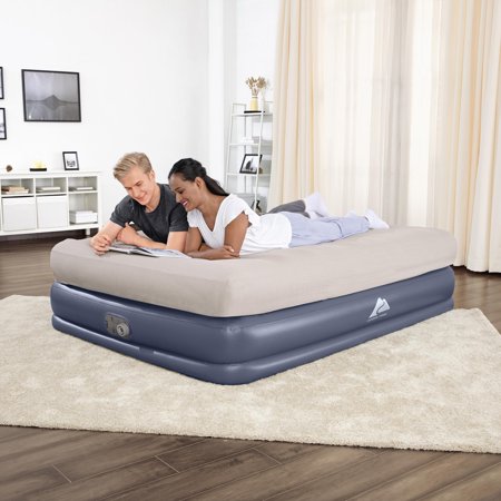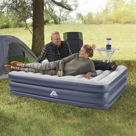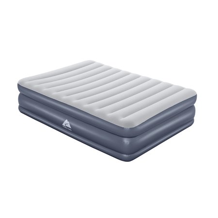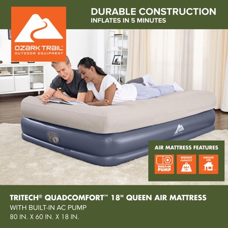 Wake up renewed and refreshed on the Ozark Trail® Tritech® QuadComfort™ Air Mattress, featuring a fitted sheet-friendly design and convenient built-in pump. The internal structure, constructed with premium, durable Tritech material, increases stretch-resistance and allows the mattress to keep the same shape no matter how many times it's inflated and deflated. Specifically engineered for firmness, this material minimizes air loss throughout the night. The bed features a top layer that is the same height as a traditional mattress, allowing you to use your favorite sheets without them slipping off. The built-in pump inflates the mattress in 5 minutes, so it is ready for bed when you are. In the morning, simply deflate and place your flattened bed in the included carry bag for easy transport and storage.