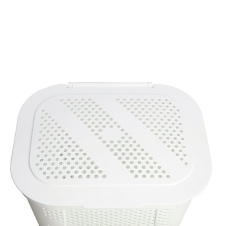 Keep your space tidy and organized with the Mainstays Hinged-Lid Laundry Hamper. Designed with functionality in mind, this hamper features a durable hinged lid to keep laundry neatly contained, while hexagon-shaped ventilation holes provide optimal airflow—ideal for damp towels or clothes. Its compact footprint makes it a great fit for most rooms, and the built-in side handles offer easy transport from room to room. Suitable for all ages and perfect for any home, this versatile hamper combines style and convenience. Product Dimensions: 17.32" W x 13.78" D x 23.9" H. Available now in white, in-store or online at Walmart.com.